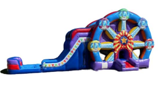 Guests of all ages will love our 2 Lane Ferris Wheel Combo, a large party inflatable that includes an 8FT slide and a bounce area, as well an inside hoop for added fun! The Ferris Wheel scheme and vibrant colors are eye-catching, and the double-lane slide provides hours of entertainment! Your party will be the most commented and unforgivable experience and your friends and family will love it. Book now before it's gone.