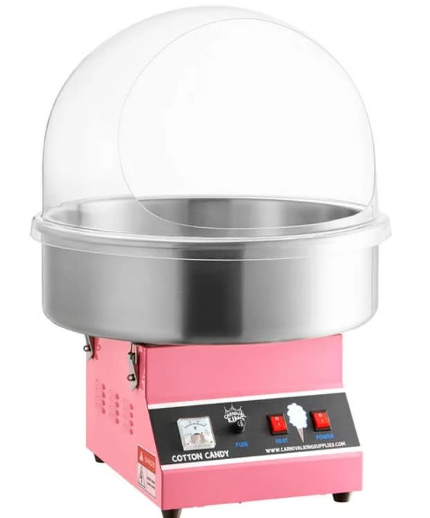 This cotton candy machine is the stainless steel model and features a full "bubble" to keep the floss sugar from floating out of the pan and all over your party! The machine sets up on any table and is easy to use. Please note that this item must be rented WITH an inflatable, otherwise additional pricing/ fee will apply.